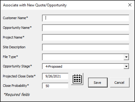 When associating an RFP response document to a new opportunity the Associate with New Quote/Opportunity window will open; complete the required fields.