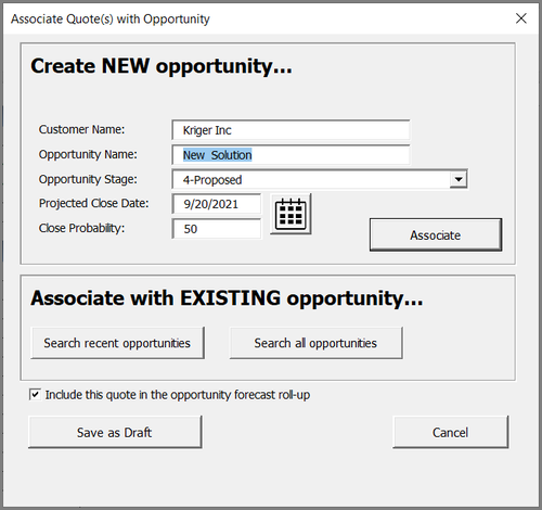 When you first save a Quote File (for Outline-driven responses) at the Desktop in Excel, you will be prompted to associate the Quote File with a new or existing Opportunity.