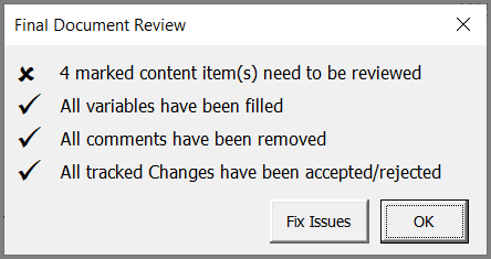 After you have inserted content, completed all content reviews, created/filled in any variables, and made any other changes in your RFP response document, you’re ready to do a final check. This feature sweeps through the active document and finds any unreplaced variables, sections marked for review that have not been reviewed, remaining comments, and any tracked changes that have not been accepted/rejected.